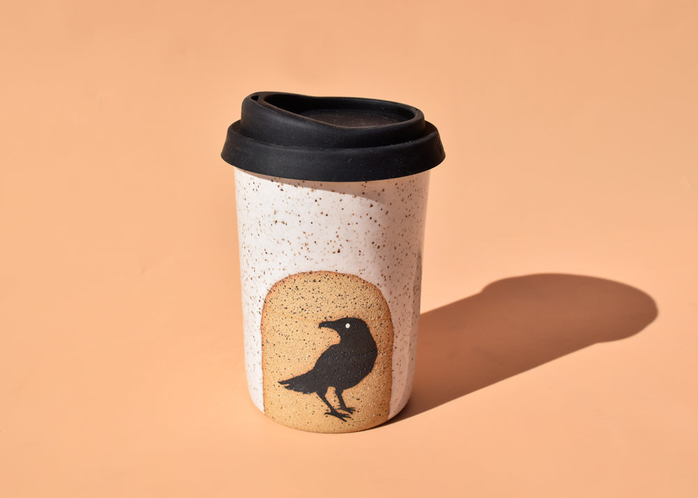 Wheel thrown travel with speckled tan clay. Glazed in glossy white with hand painted crows. Comes with black silicone lid and translucent heat band.
