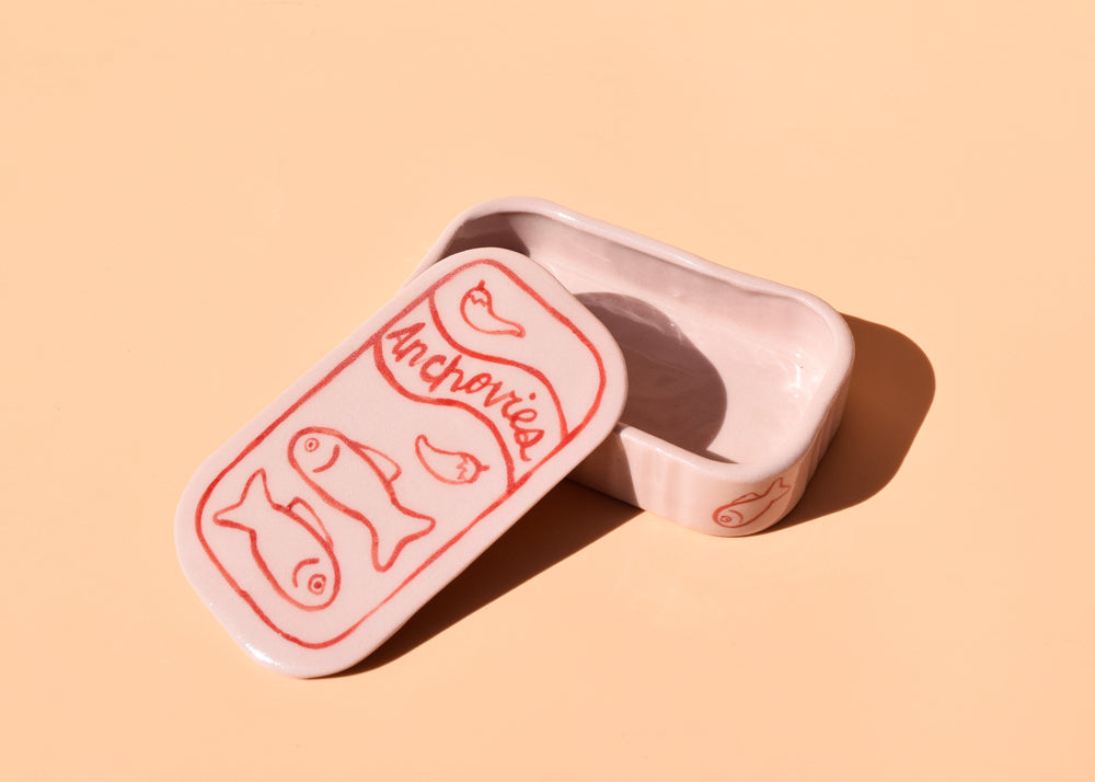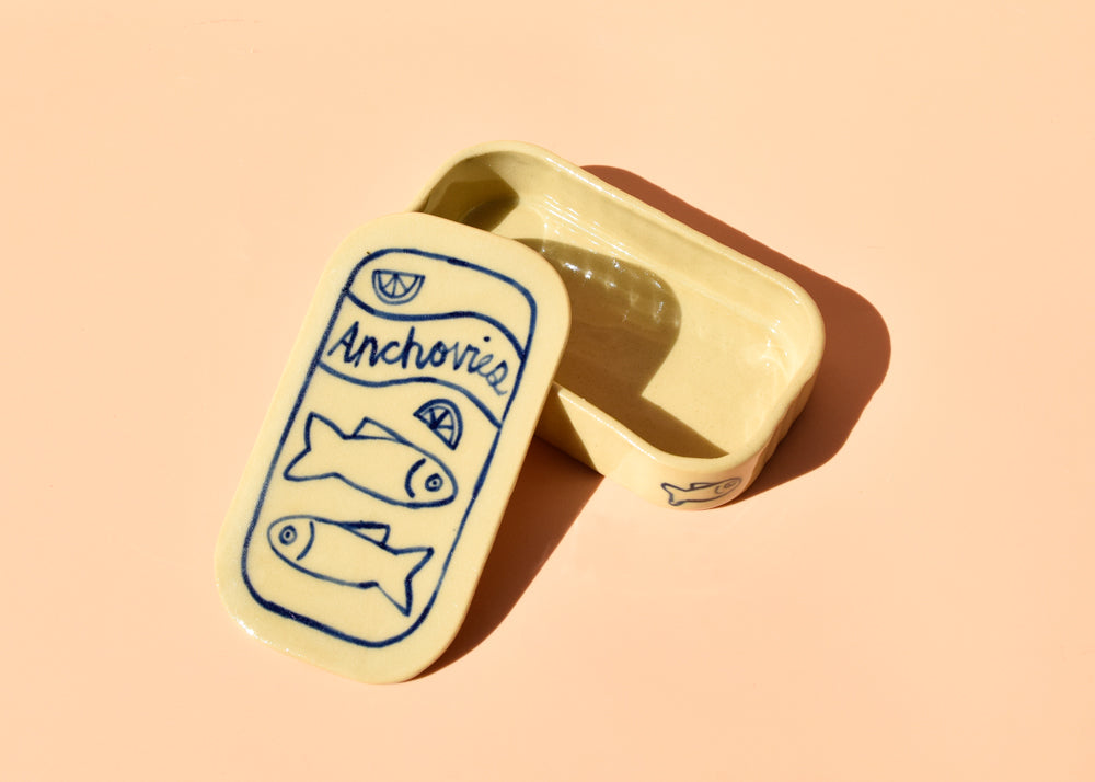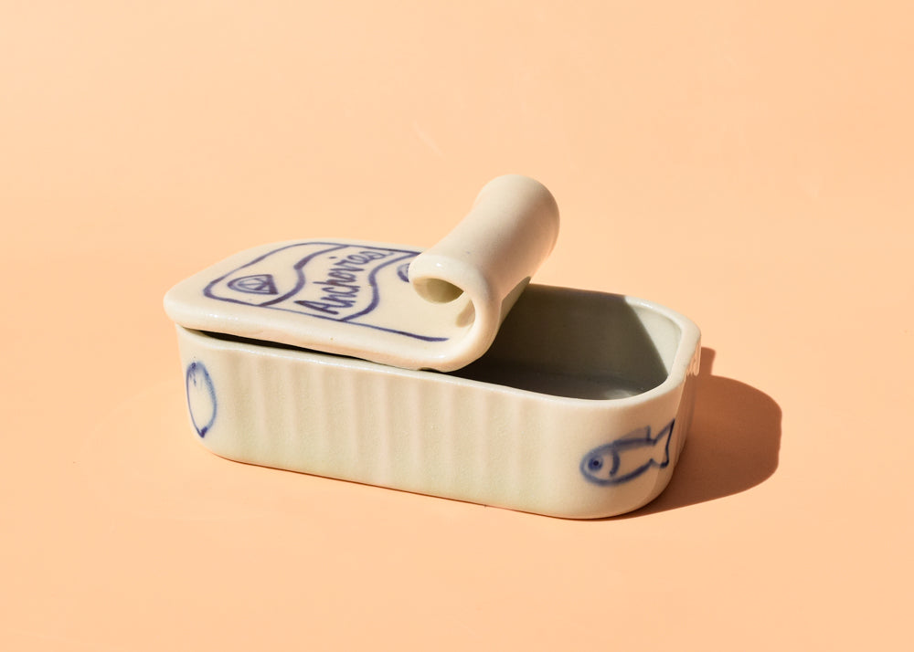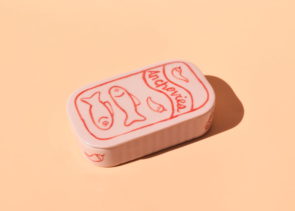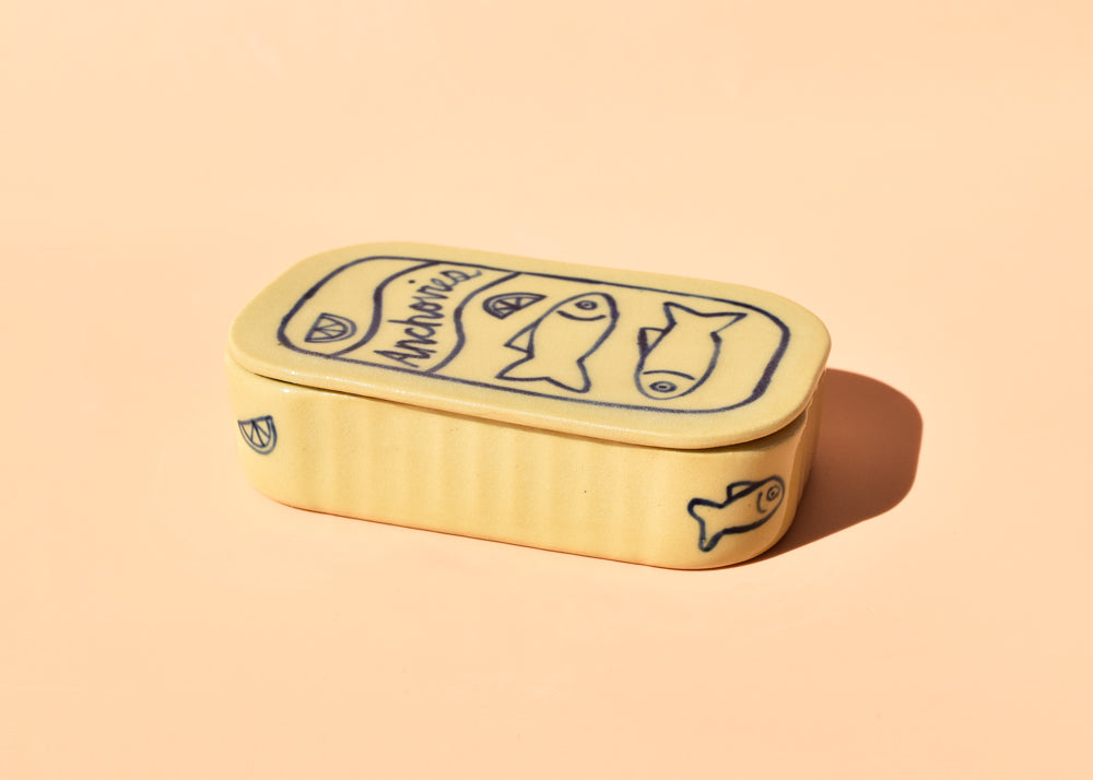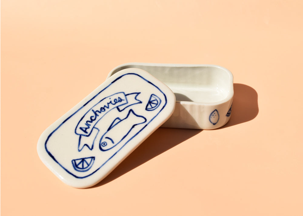 These slip cast and hand painted ceramic dishes are inspired by vintage tinned fish designs. Perfect for jewelry, trinkets, fancy butter, anchovy fillets.