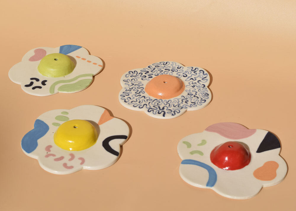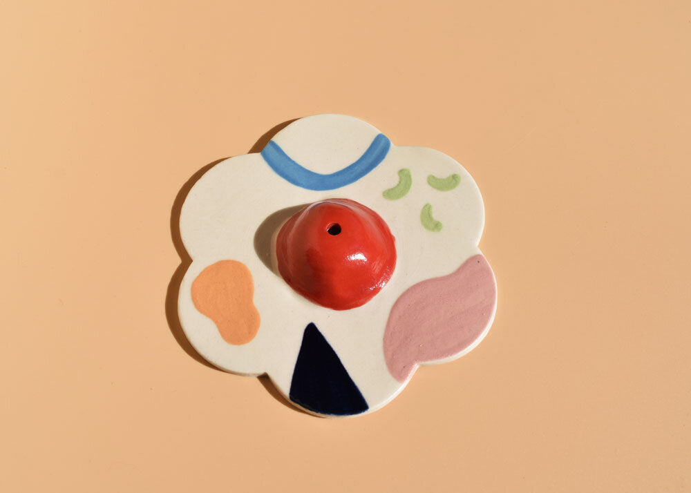 Porcelain incense holder in shape of daisy. Raised center has hole for holding an incense stick. Designs are painted using underglaze and then coated in a glossy clear glaze.