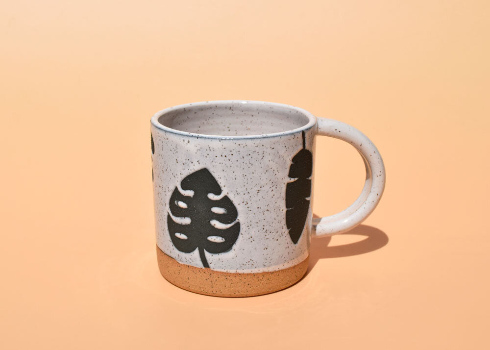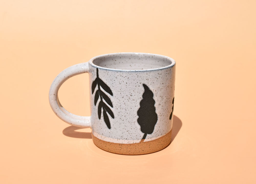 Wheel thrown mug using speckled stoneware clay with plant pattern created using slip and wax resist. Glazed in glossy white