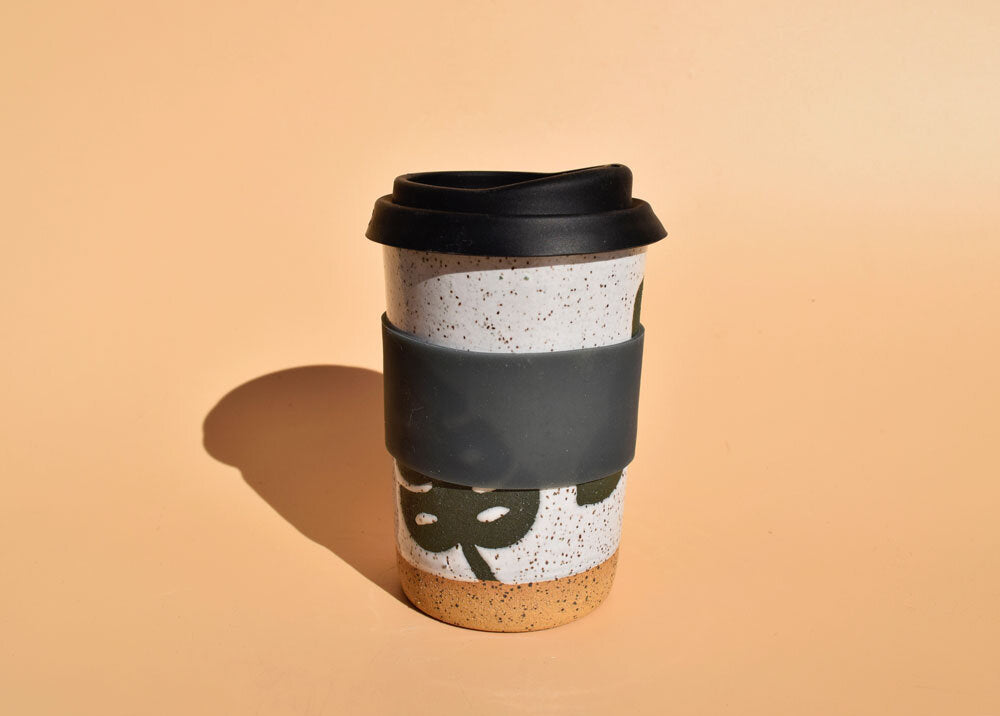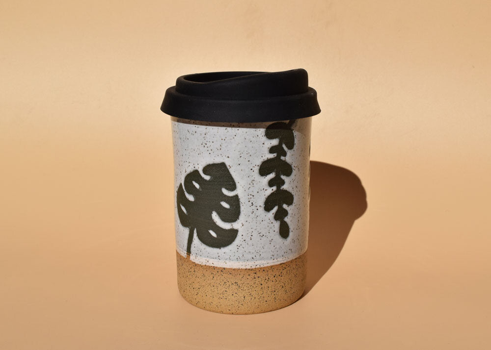 Wheel thrown travel cup using speckled stoneware clay with plant pattern created using slip and wax resist. Glazed in glossy white.