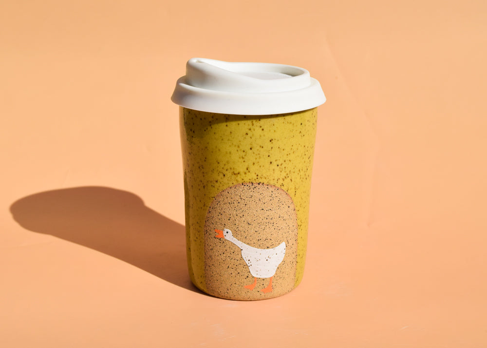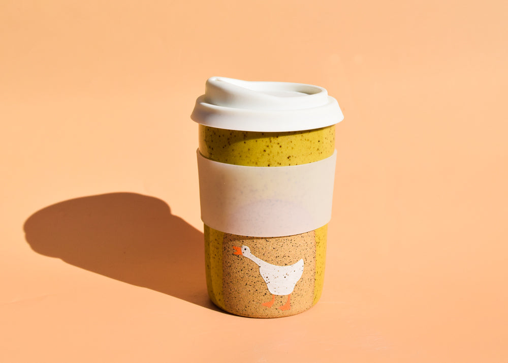 Take your beverages on the go with our Goose Travel Cup! With its playful yellow design, this cup is sure to bring a smile to your face. Whether you're heading to work or on a road trip, our cup will add a fun touch to your day. Comes with white silicone lid and translucent heat band.