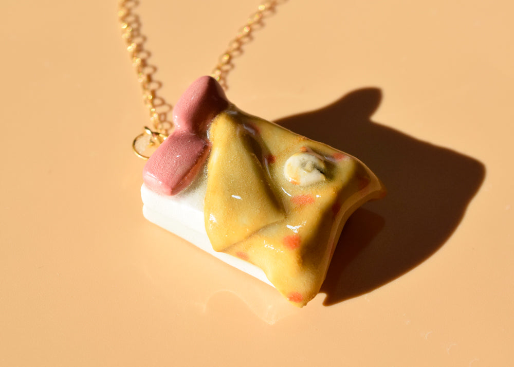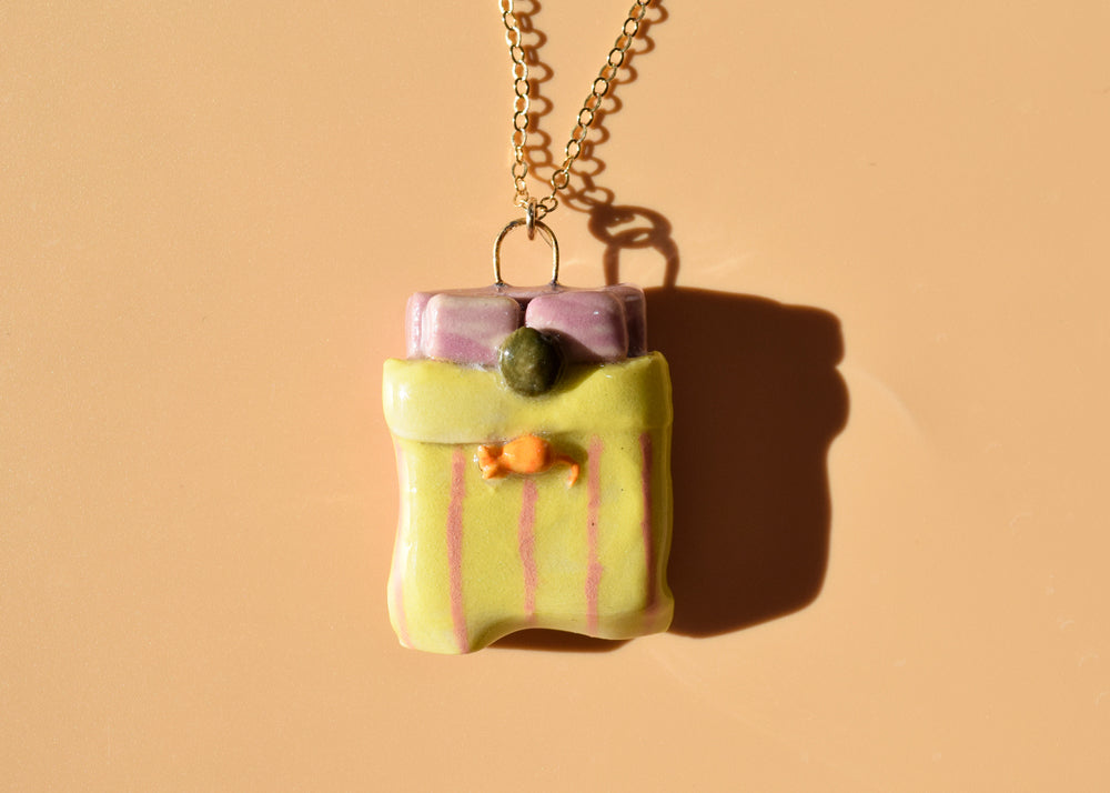 These sweet necklaces are hand made and hand painted and glazed in a glossy clear. Each bed is unique in its bedding and which snoozing animal lays across it.