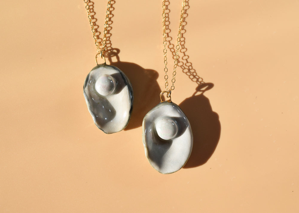 Hand made and hand painted oyster charm glazed in glossy clear with pearlescent pearl.