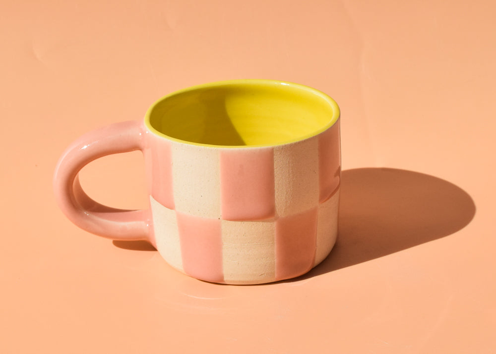Wheel thrown mug using white stoneware clay. Peachy pink glaze on exterior and raw unglazed clay create checkered pattern. Interior glazed in bright glossy yellow.