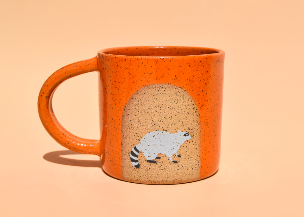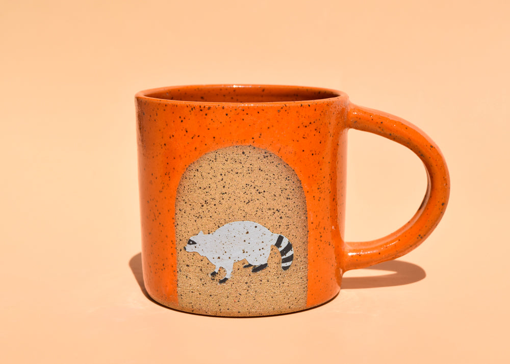Indulge in your morning coffee with the charming and lively Raccoon Mug! Hand painted and glazed in glossy orange, this wheel thrown mug boasts a playful raccoon design.