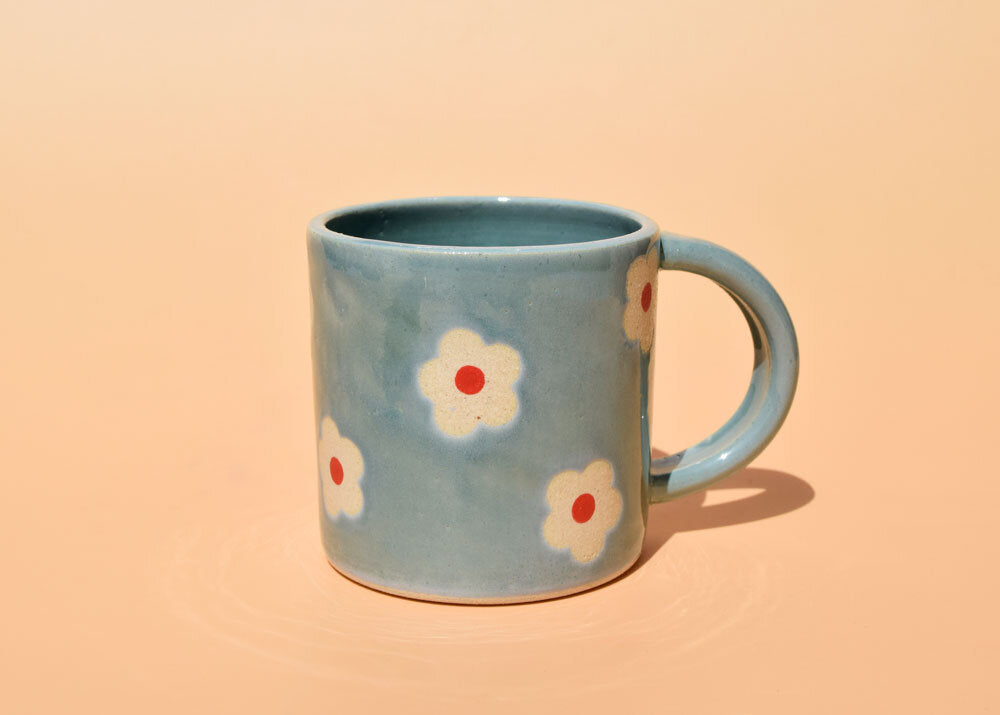 Wheel thrown mugs using white stoneware clay. Glazed in glossy opalescent blue. Flower designs are made using underglaze for the centers and raw clay for the petals.