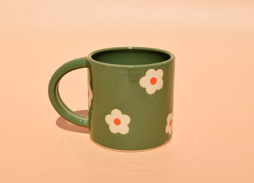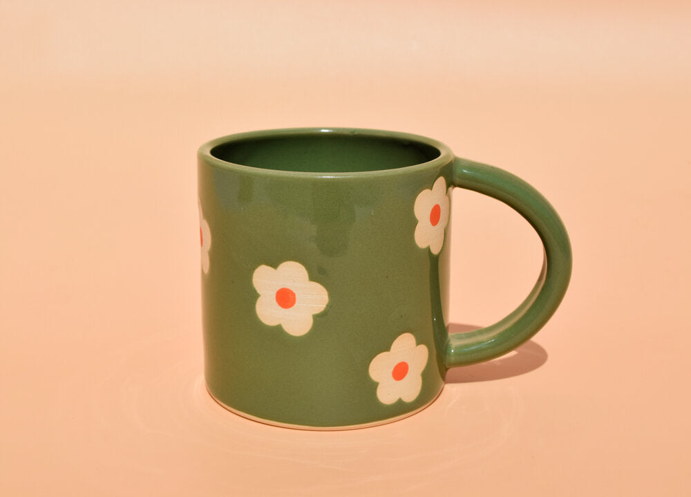 Wheel thrown mugs using white stoneware clay. Glazed in glossy green. Flower designs are made using underglaze for the centers and raw clay for the petals.